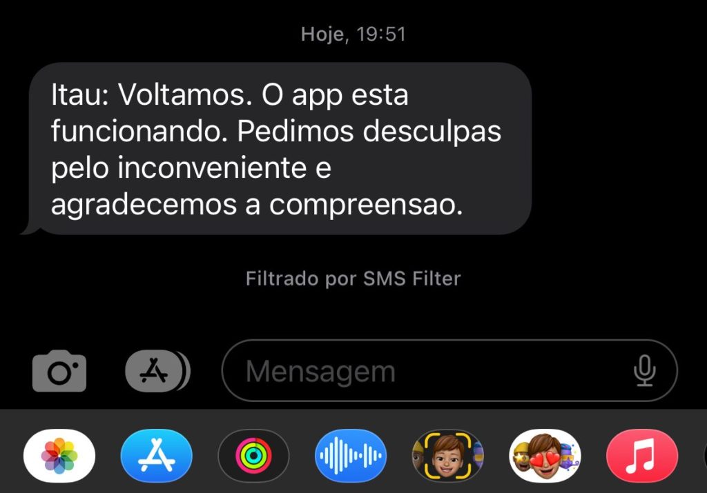 Após um dia inteiro indisponíveis, os serviços do Banco Itaú e do Iti, conta digital da marca, voltaram a operar dentro da normalidade. Por volta das 20h, a empresa enviou uma mensagem por SMS, e-mail e na tela de entrada do app para pedir desculpas aos consumidores “pelo inconveniente”. Abaixo está a mensagem enviada por correio eletrônico para os clientes: