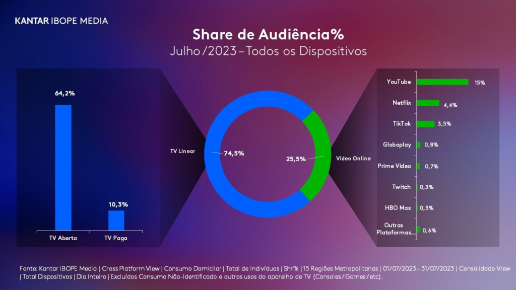 Esses dados são fornecidos pelo Cross Platform View (CPV), uma solução da Kantar IBOPE Media que oferece uma visão abrangente da audiência de televisão linear e do consumo de vídeo online. Isso significa que o CPV leva em consideração o consumo de vídeo em todos os dispositivos conectados, proporcionando uma análise completa do cenário de consumo de vídeo domiciliar em julho de 2023.