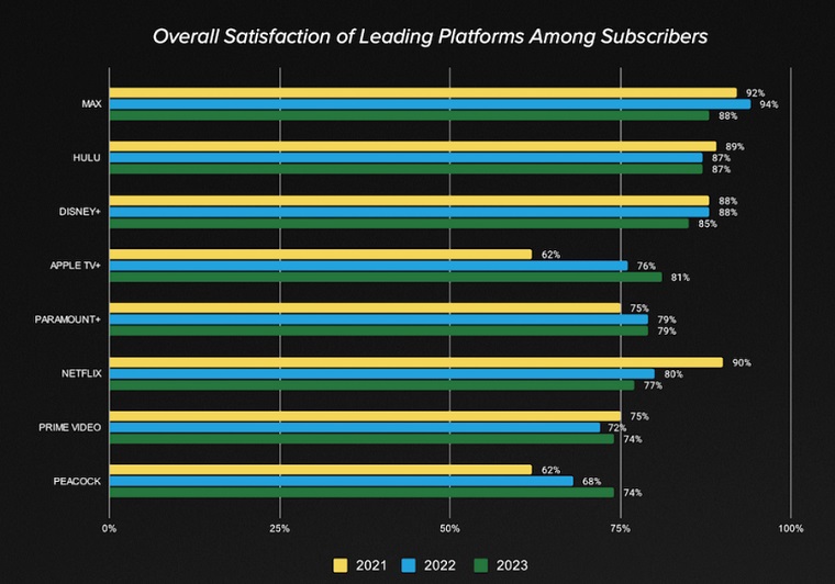 Outro ponto analisado pela pesquisa é a satisfação dos consumidores com as plataformas. De acordo com a da Whip Media, esse quesito está em declínio nos streaming de primeira linha (Netflix, Disney+ e Max), enquanto tem crescido no intermediários, como Apple TV+, Hulu, Peacock, Amazon Prime Video e Paramount+, devido às melhorias na qualidade do conteúdo, variedade e valor do produto.