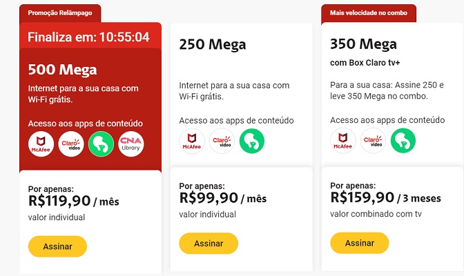 Quer assinar um serviço de internet banda larga fixa com preço mais barato que o normal? A Claro está com oferta promocional relâmpago. Pelo valor de R$ 119,90 mensais, o consumidor levará 500 mega de internet; um desconto de R$ 20, uma vez que o pacote normalmente custa R$ 139,90/mês.