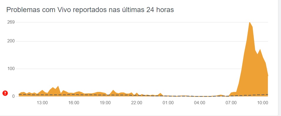 A checar o Downdetector, plataforma especializada em registros de reclamações e acompanhamento de problemas relatados por usuários, a operadora está com um pico de quase 270 notificações , sendo que 44% dos problemas relatados estão na ausência de sinal da operadora, 34% na internet fixa e 22% na falta de internet móvel.