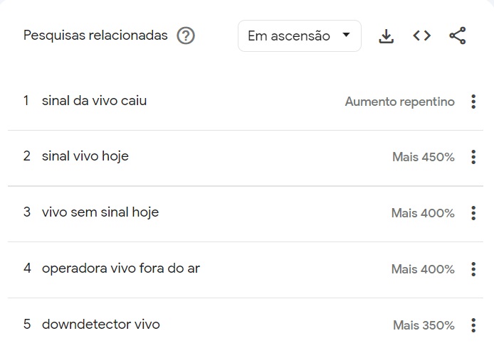 De acordo com o Google Trends, ferramenta que monitora das buscas feitas no buscador, há um pico de interesse no assunto, houve um aumento repentino nas pesquisas como “Vivo sem sinal hoje”, “Vivo está sem sinal”, “Sinal da Vivo caiu” e ” Vivo com problema de sinal hoje”.