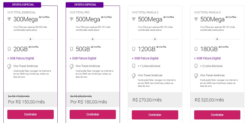 O plano mais acessível do Vivo Total é Essencial, onde inclui internet de 300 Mbps e franquia de 20 GB para internet móvel. Geralmente, ele custa R$ 170 mensais, mas está em promoção pelo valor de R$ 150 mensais, uma redução de R$ 20. Outro plano que também teve redução de preço é o Vivo Total Pro, com 500 Mbps de internet via fibra óptica e 50 GB de franquia de dados móveis, que de R$ 200 mensais caiu para R$ 180/mês.
