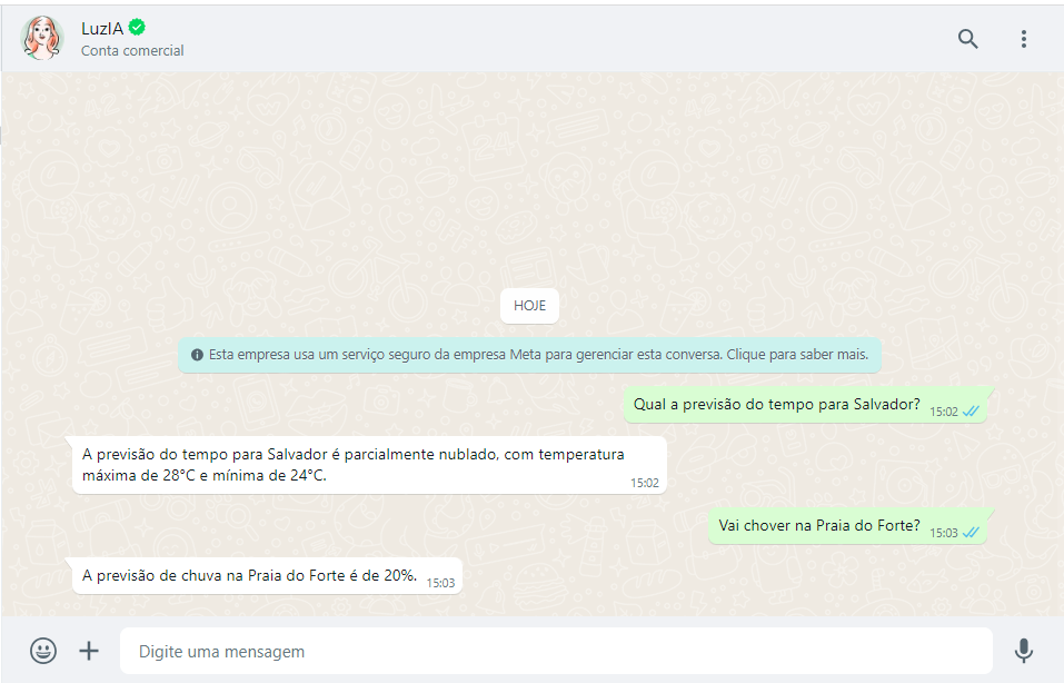 Na última semana, o chatbot do WhatsApp introduziu uma nova funcionalidade que oferece informações sobre a previsão do tempo. Esta atualização visa melhorar a experiência dos usuários ao interagir com a inteligência artificial. Agora, é possível solicitar informações básicas sobre a previsão do tempo em diversas cidades e receber respostas rápidas e precisas da LuzIA.
