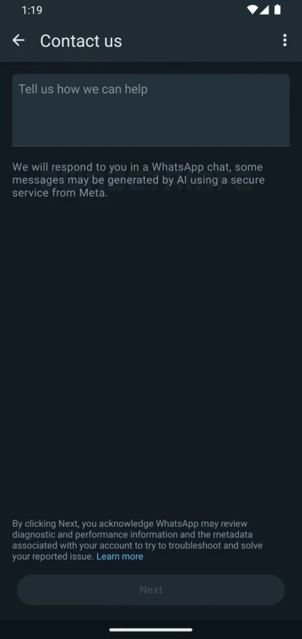 Conforme evidenciado na imagem anteriormente apresentada, o mensageiro WhatsApp destaca a capacidade de algumas respostas serem geradas por meio da inteligência artificial, utilizando um serviço seguro oferecido pela Meta, a empresa-mãe do WhatsApp. Essa introdução de IA tem o propósito de agilizar o processo de atendimento no canal de suporte do aplicativo e, ao mesmo tempo, aprimorar a experiência do usuário.