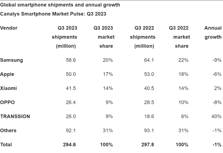 Em comparação com o mesmo período do ano anterior, a Samsung e a Apple registraram quedas de 9% e 6%, respectivamente. Já a Xiaomi teve um crescimento de 2%, e a Transsion, fabricante chinesa, registrou um crescimento de 40%.