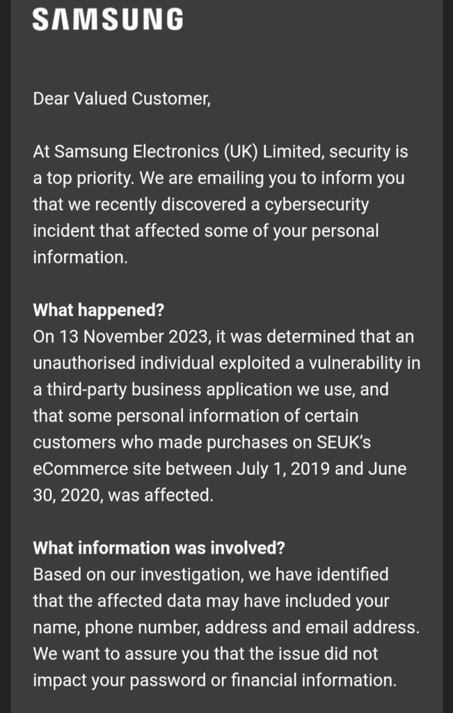 A representante da Samsung, Chelsea Simpson, que falou em nome da empresa por meio de uma agência terceirizada, emitiu uma declaração ao site TechCrunch reconhecendo que a companhia foi “recentemente alertada sobre um incidente de segurança” que resultou na obtenção ilegal de “certas informações de contato de alguns clientes da loja eletrônica da Samsung no Reino Unido”.