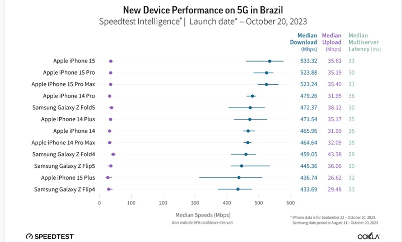 No ranking montado pela Ookla, somente quatro modelos da Samsung no Brasil aparecem apenas listadas: Galaxy z Fold 5 (472,37 Mbps), Galaxy Z Fold 4 (459,05 Mbps), Galaxy Z Flip 5 (445,36 Mbps) e Galaxy Z Flip 4 (433,69 Mbps).