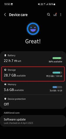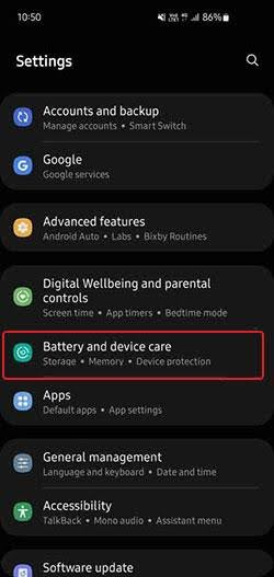 - Vá para o aplicativo Configurações, role para baixo e toque na opção Bateria e cuidados com o dispositivo (em alguns dispositivos Android, você pode encontrar Bateria e Armazenamento).