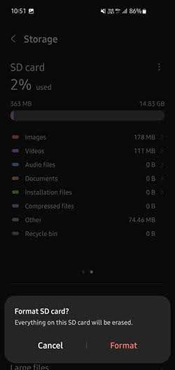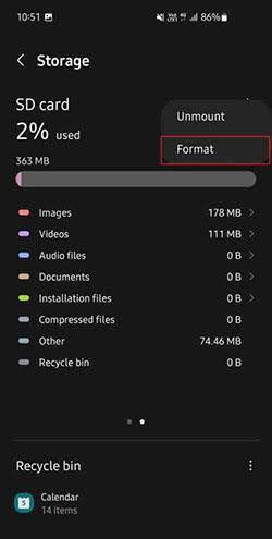 - Seleccione Formatar cartão de memória e escolha formatar o cartão SD.