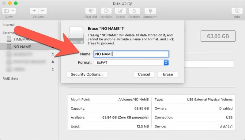 - Quando a janela pop-up aparecer, pode alterar o nome e escolher o formato do sistema de ficheiros do seu cartão.