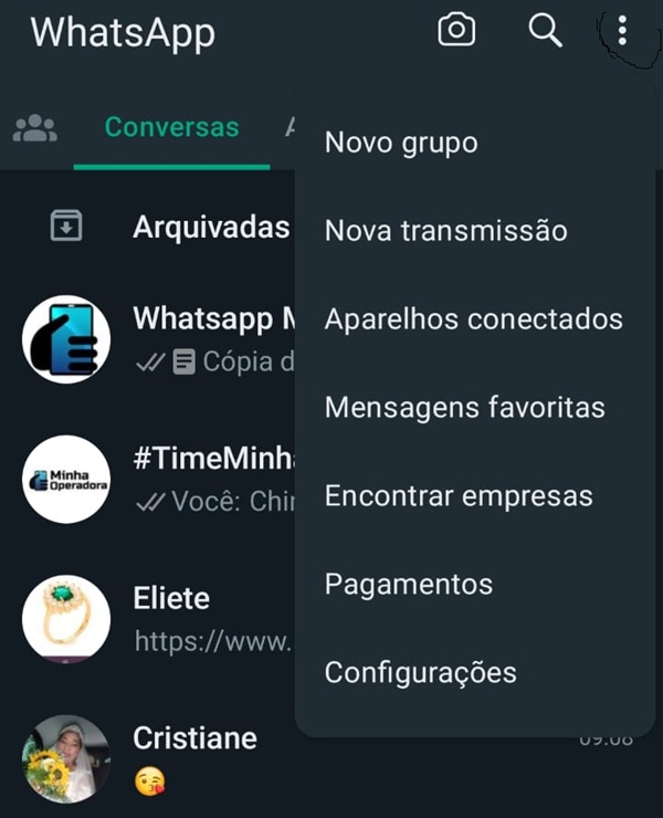 Primeiro, assim mostra a imagem abaixo, abra o aplicativo do WhatsApp e clique na opção de três pontinhos no canto superior direito e selecione a opção “confgiruações”.