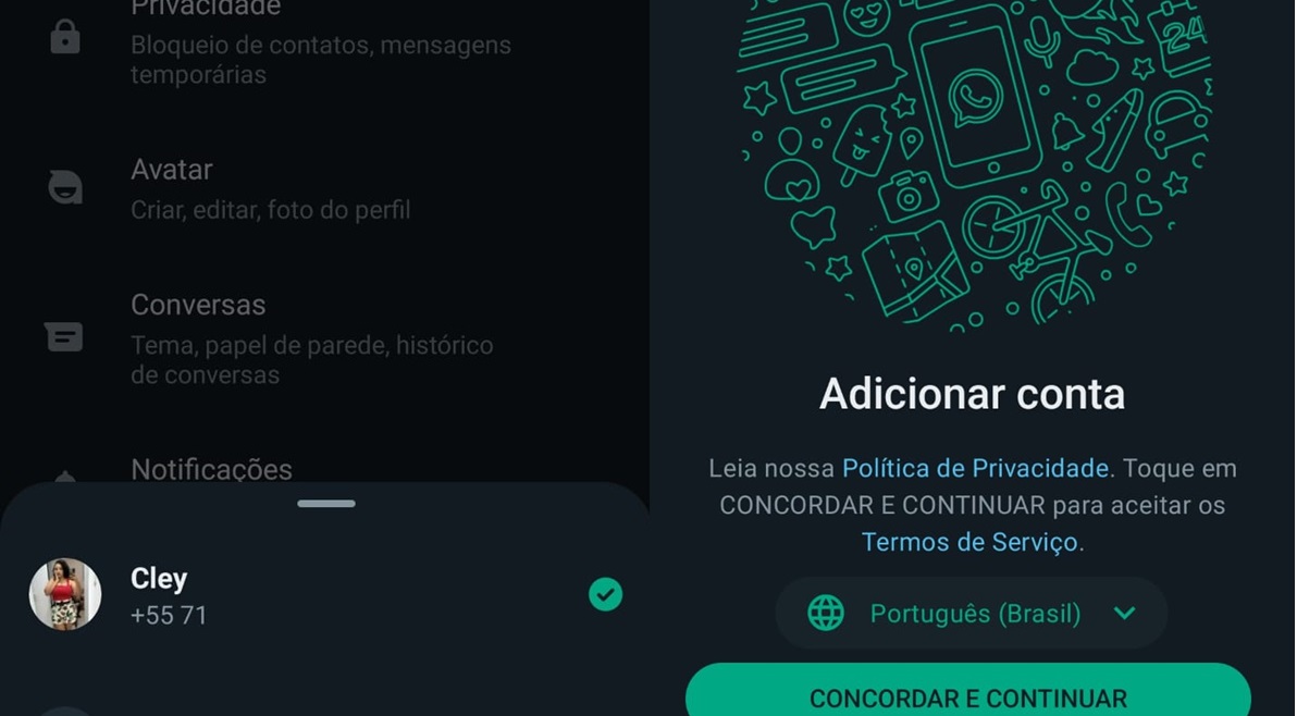 Na tela seguinte, clique na seta que fica ao lado da sua foto de perfil e selecione a opção adicionar novas contas. O Whatsapp vai lhe direcionar para uma tela inicial, onde será necessário concordar com os termos e prosseguir com a configuração. Na sequência, terá que inserir o número secundário do novo perfil.