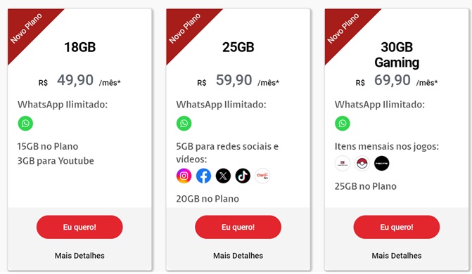 O mais em conta custa R$ 49,90, com franquia de 18 GB de internet, sendo 15 GB no Plano mais 3 GB de bônus exclusivos para assistir aos vídeos do Youtube, WhatsApp liberado para navegar e ligações de voz e vídeo, sem descontar do pacote de internet. Entretanto, esse valor é para débito em conta e fatura digital, e com fidelidade de 12 meses. O preço muda se for em fatura e sem fidelização.