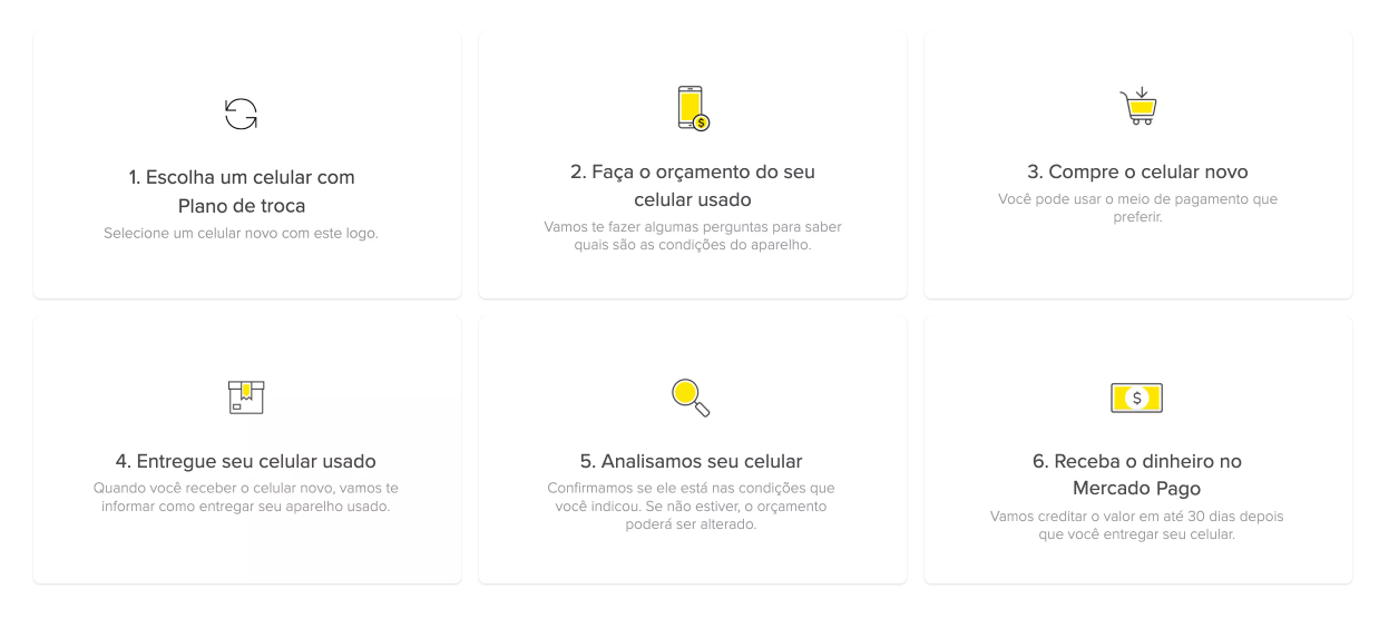 O Mercado Livre oferece o Plano de Troca, permitindo que os usuários troquem seus celulares antigos por um desconto na compra de um novo. De tal forma, para solicitar o plano, é necessário ter um celular que funcione corretamente, independentemente das condições físicas, e fornecer o número do IMEI durante o orçamento.