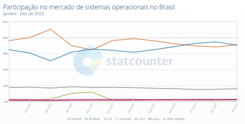 O Android é o sistema operacional mais usado pelos brasileiros, embora tenha perdido seu posto durante alguns meses de 2023. Em janeiro, tinha 45,97% de participação, e terminou o ano com 42,9%. Já o iOS aparece na terceira posição (9,73%), perdendo para o Windows, com 42,54% de participação.