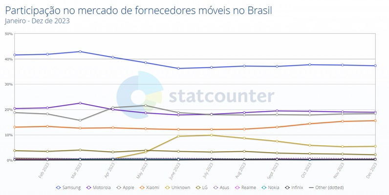No ranking aparecem outras empresas, como Xiaomi, LG, ASUS, Realme, Nokia e Infinix, mas com uma menor fatia de mercado. Entre elas, quem se destaca é a Xiaomi, que manteve uma participação bem estável durante 2023, oscilando entre 12,14% e 15,57% de participação de mercado de fornecedores móveis no Brasil.