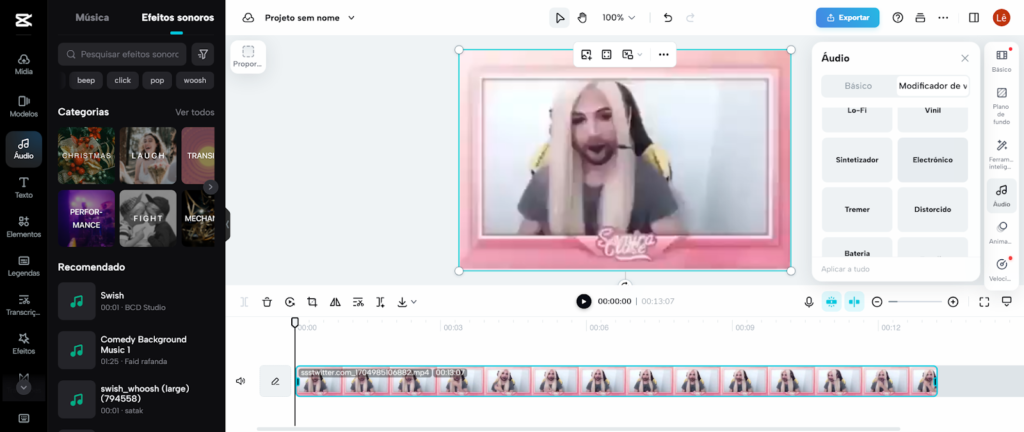 Ao clicar em “modificador de voz”, você deverá escolher qual efeito gostaria de usar, entre os múltiplos mencionados anteriormente. Ao selecioná-lo, o CapCut Online irá levar alguns segundos (ou minutos, dependendo da velocidade da internet) para aplicar o efeito em todas as partes do vídeo.