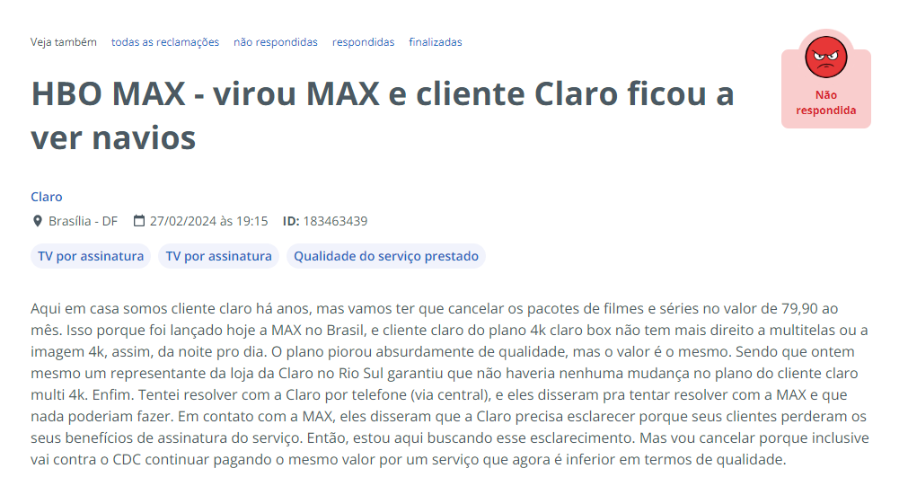 “Aqui em casa somos cliente claro há anos, mas vamos ter que cancelar os pacotes de filmes e séries no valor de 79,90 ao mês. Isso porque foi lançado hoje a MAX no Brasil, e cliente claro do plano 4k claro box não tem mais direito a multitelas ou a imagem 4k, assim, da noite pro dia.”