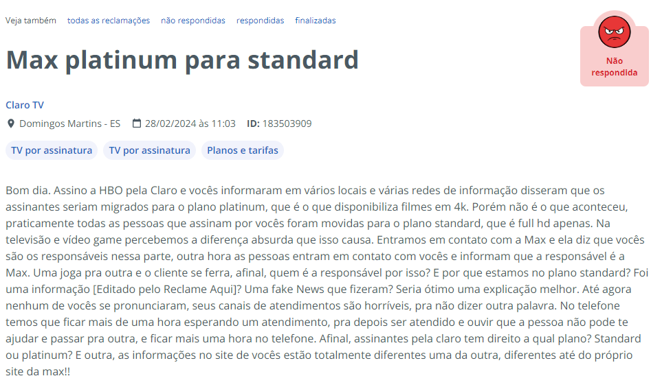 Em outra queixa, também no Reclame Aqui, um cliente expressou a insatisfação de ser um assinante da HBO pela Claro. Segundo ele, foi informado, através de diversas fontes, que seria migrado para o plano Platinum, que oferece filmes em 4K. Entretanto, ao invés disso, foi movido para o plano Standard, que oferece apenas resolução Full HD.