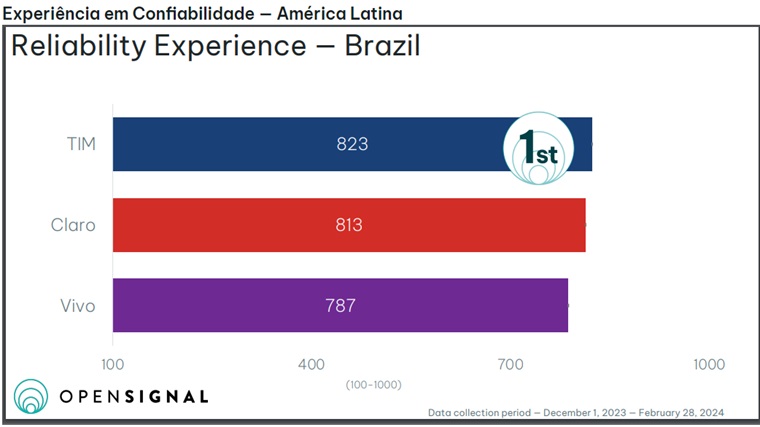 A Vivo ficou em terceiro lugar, com 787 pontos. A liderança vai para a TIM, que superou a Claro (813 pontos) ao pontuar 823 pontos na escala da OpenSignal. Ou seja, é considerada a operadora móvel mais confiável do Brasil. O período que foi feita a coleta é referente ao início de dezembro de 2023 ao final do mês de fevereiro deste ano. Em janeiro, a mesma companhia esteve na liderança em relação à melhor disponibilidade de sinal 5G.