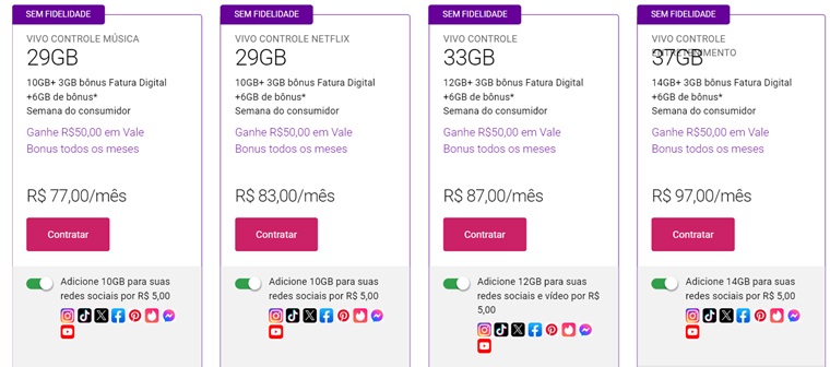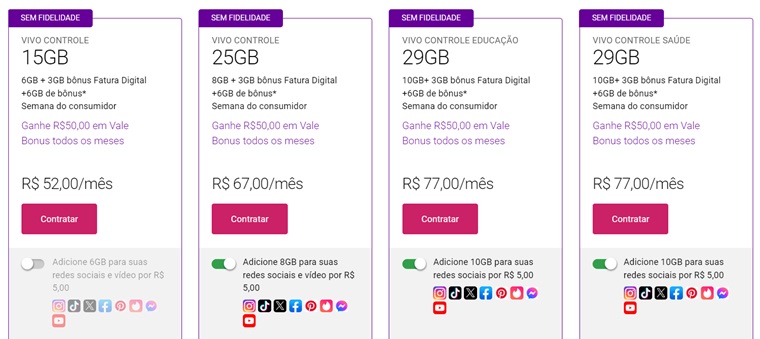 No Vivo Controle, o cliente tem a sua disposição oito opções de pacotes (valores que variam entre R$ 52/mês e R$ 97 mensais) com os mais variados benefícios: Nesse caso, ao contratar um desses planos, o consumidor levará de bônus 6GB de internet, conforme imagem abaixo: