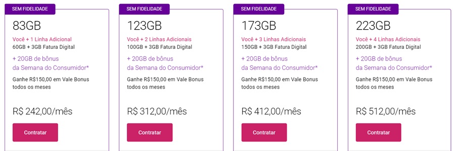 Já o Vivo Pós Família, o bônus é ainda maior. Com planos custando entre 242/mês e 512 mensais, o cliente ganha 20 GB de bônus na Semana do Consumidor.