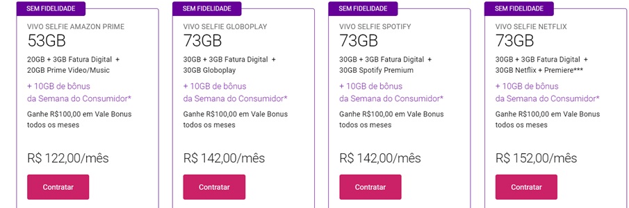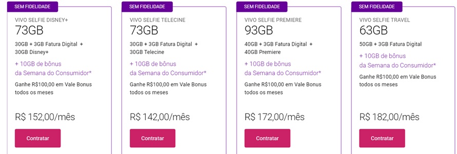 No Vivo Pós, na modalidade Selfie, o bônus de internet é de 10 GB na Semana do Consumidor. Os valores dos planos variam entre R$ 122 mensais a R$ 182/mês.
