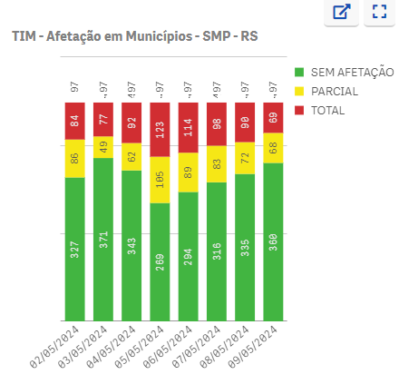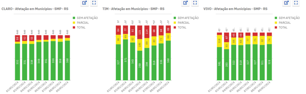 A rede da TIM encerrou o dia da última quinta, 9, com afetação total em 69 municípios, no Sul do país. A Anatel – Agência Nacional de Telecomunicações, lançou nesta semana um painel para monitoramento do sinal das redes móveis na região. Esta localidade do país tem sido fortemente afetada com chuvas e inundações que tem levado a falha nos diversos tipos de serviços de comunicação.