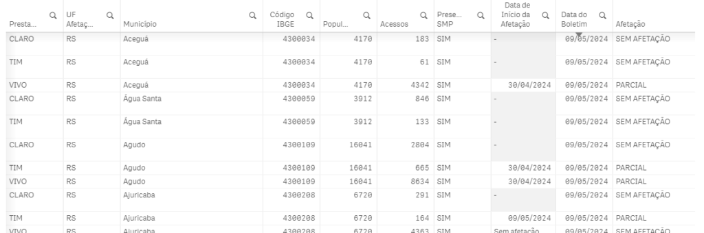 Nesta tabela é possível avaliar os dados de maneira mais minuciosa, olhando de acordo com as companhias, os estados, municípios, data da perda de de sinal e qual a proporção dessa falha de serviço, se é total ou parcial.