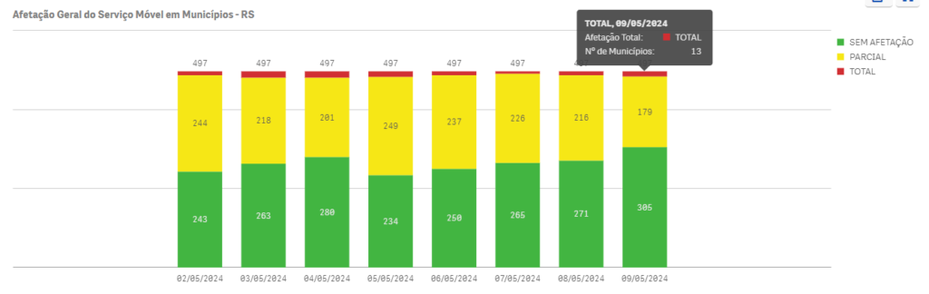 A afetação total em todas as operadoras também é um cenário atual. Ou seja, há locais que estão totalmente remotos, sem sinal de rede móvel de nenhuma companhia. Até ontem, este número estava em 13 municípios.