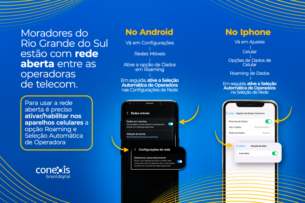 Ou seja, conforme a Anatel explica, nas regiões afestas pelas fortes chuvas e inundações está liberado o roaming compartilhado:”o serviço que permite ao cidadão se manter conectado com rede de outra prestadora quando a sua prestadora original sai do ar, de forma gratuita e, na grande maioria dos casos, sem necessidade de configurações no celular“.