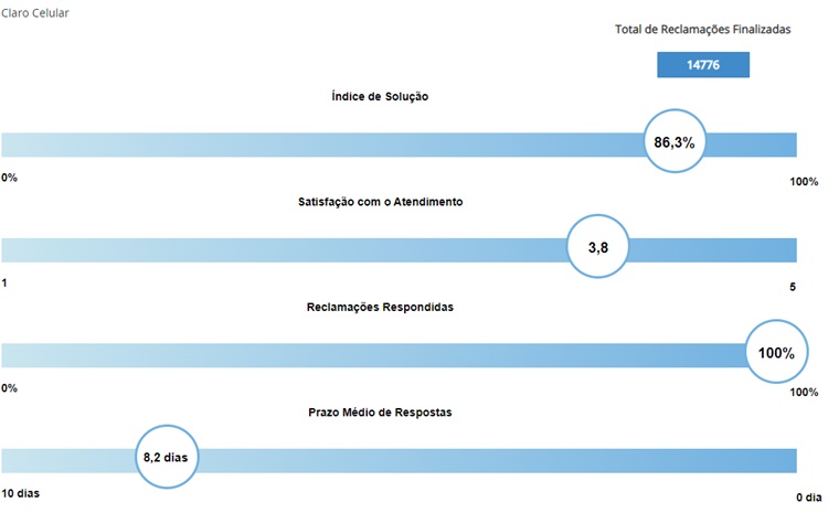 Entre janeiro e junho, a Claro teve no portal uma total de 14.776 mil reclamações, com índice de respostas em 100%, e tempo médio de 8,2 dias para retorno da demanda. No entanto, a operadora apresenta uma performance de solubilidade e satisfação do cliente pior do que a Vivo. De todos, a Claro conseguiu resolver 86,3% dos casos, com uma média de satisfação do cliente em 3,8.