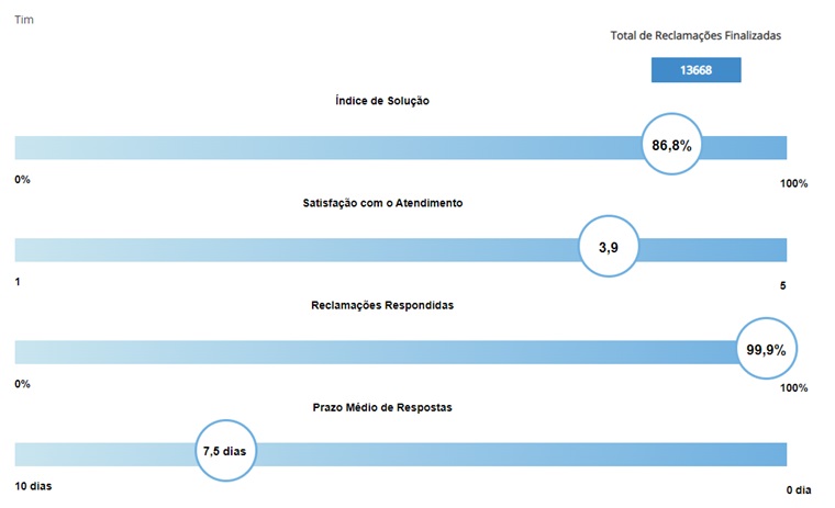 Já a TIM possui um total de 13.668 de queixas no canal, sendo 99% delas foram respondidas, com prazo médio de respostas de 7,5 dias. Seu Índice de Solução é de 86,8%, mas a satisfação do cliente deixa a desejar, com média de 3,9.