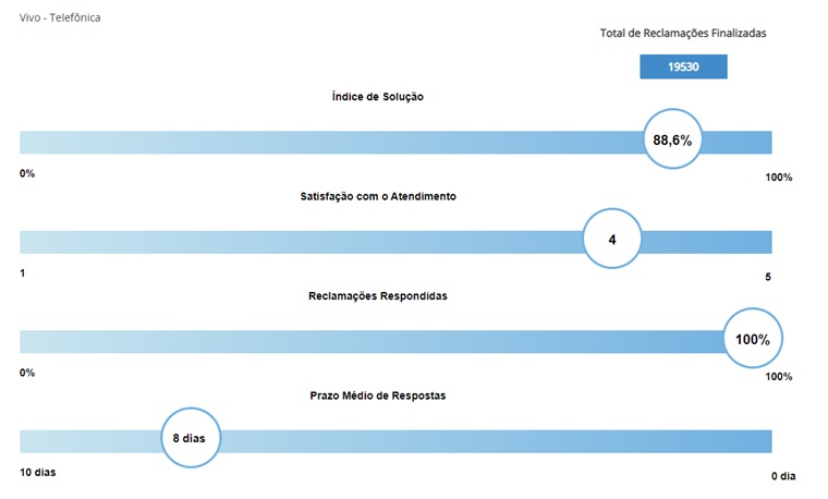 Até junho de 2024, a plataforma já registrou 19.530 mil reclamações. O prazo médio de resposta foi de 8 dias úteis, sendo que todas foram devidamente respondidas. No entanto, o índice de solução da tele é de 88,6%, com uma média de 4% de satisfação do cliente. Ou seja, embora a Vivo tenha respondido todas as demandas registradas, isso não quer dizer que foi encontrada uma solução satisfatória para o consumidor.