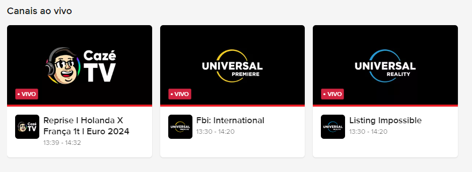 Assinantes do streaming ao entrar no ambiente já podem ver a nova parte canais ao vivo onde está concentrada a opção de programação da CazéTV e as opções da Universal. Veja abaixo: