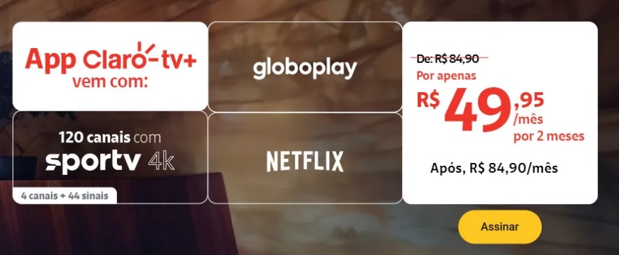 A tele também está com o plano de TV por assinatura que inclui app Claro tv+, Globoplay e 120 canais com SporTV 4K e Netflix, por R$ 49,90 por 2 meses.