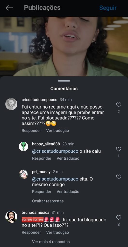 “Fui entrar no Reclame Aqui e não posso, aparece uma imagem que proíbe entrar no site. Fui bloqueada????? Como assim?????”, desabafou uma usuária no Instagram do Reclame Aqui. Outro internauta completou: “O site caiu???” e um terceiro, ainda mais assustado, disparou: “Diz que fui bloqueado no site!?!? Que isso???”.
