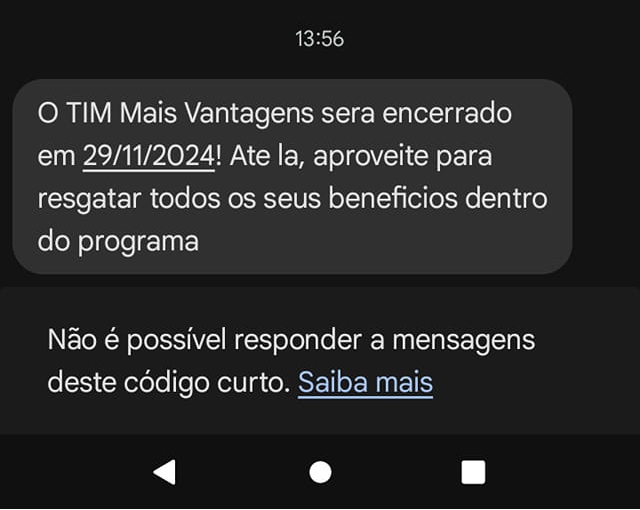 O programa “TIM Mais Vantagens” será oficialmente descontinuado no dia 29 de novembro de 2024. A operadora enviou uma mensagem informando aos clientes sobre a decisão, incentivando-os a utilizar todos os benefícios disponíveis até a data limite.