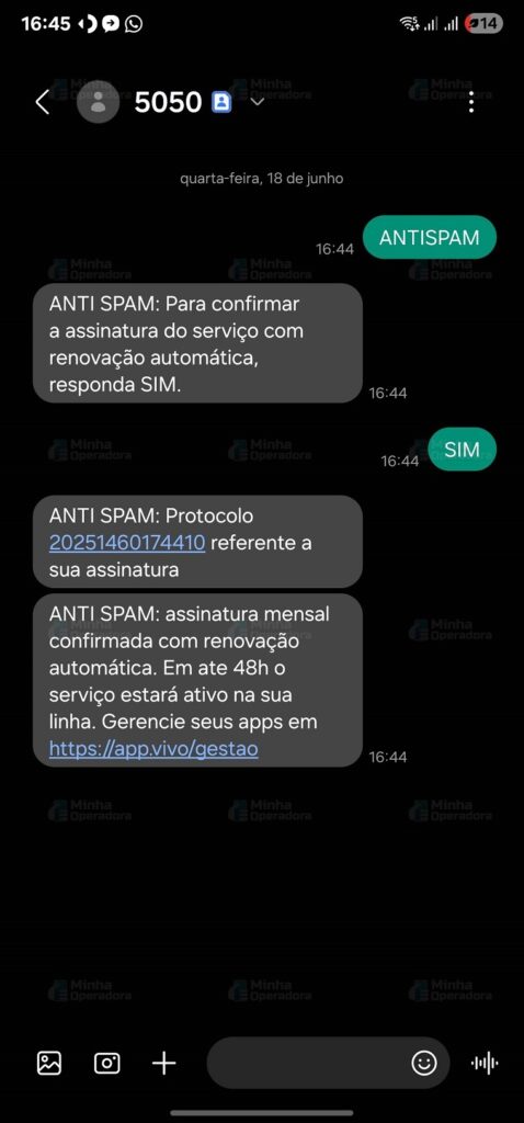 - Envie a palavra ANTISPAM para 5050. A mensagem é processada em até 48 horas; o serviço passa a funcionar logo após esse prazo.