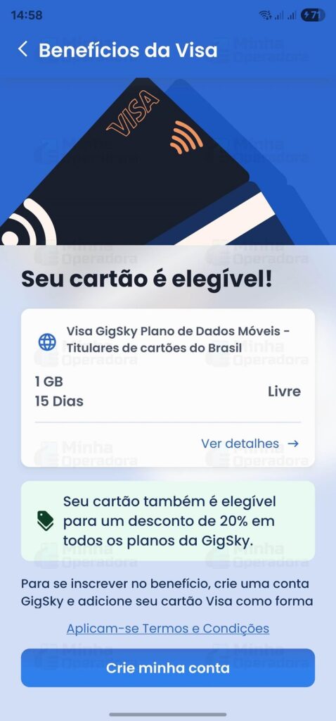 Caso você olhe na sua carteira e perceba que o cartão do seu banco é da bandeira Visa Gold ou Visa Classic, ainda é possível obter algum tipo de benefício: 20% de desconto nos pacotes da GigSky.